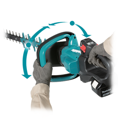 DUH601 has a rotating rear handle to make vertical and angled trimming easier and more ergonomical. Rear handle can be positioned to five different angles which lock at 45° and 90° left and right and at 0°.