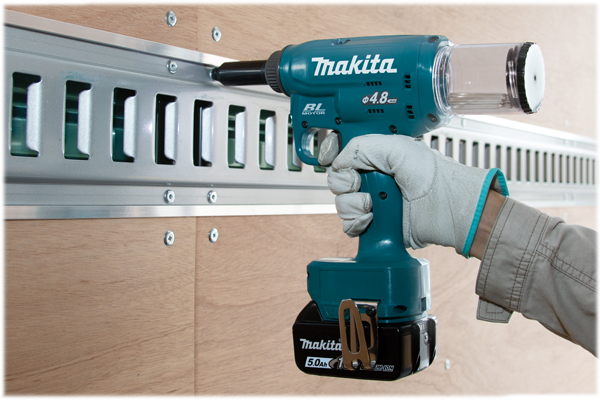 DRV150 also has a rivet holding mechanism. Once a rivet is installed, it does not drop out even when the tool is directed downward. The amount of spent mandrels can be checked easily because of the transparent mandrel container.