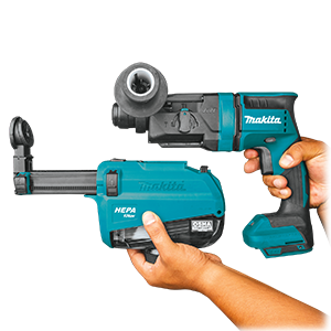 A dust extractor accessory can easily be connected for keeping the jobsite clean and cordless.