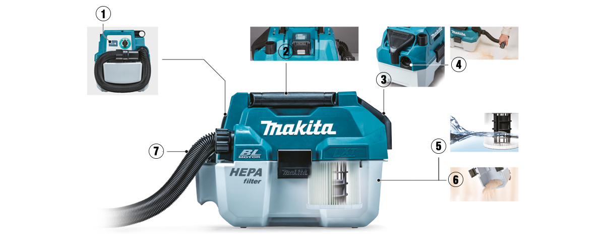 1. Battery charge level indicator 2. Power source 18V LXT battery 3. Nozzle can be stored on the vacuum cleaner 4. Air blow function 5. Vacuum cleaning 6. Easy disposal 7. Compact and flexible hose |