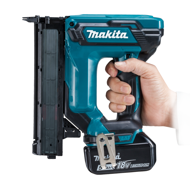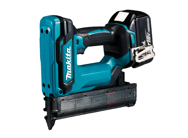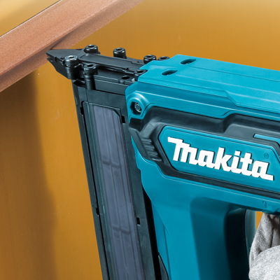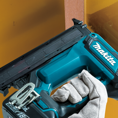 DFN350Z is lightweight and well balanced. The machine has a capacity of 35 mm for most common materials. Nailing is equally effortless up, down and sideways in different materials. The LED light illuminates the work site and the notched end piece stays firmly on the work surface and fits into a groove up to 6 mm wide. Nail adequacy is easy to check without interruption because the magazine wall is transparent. The machine uses a 1.2 mm dyckert nail (18 g) in lengths of 15, 20, 25, 30 and 35 mm.