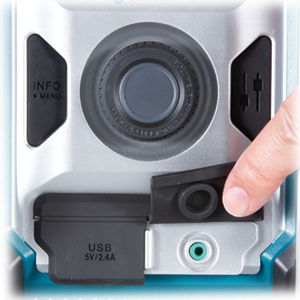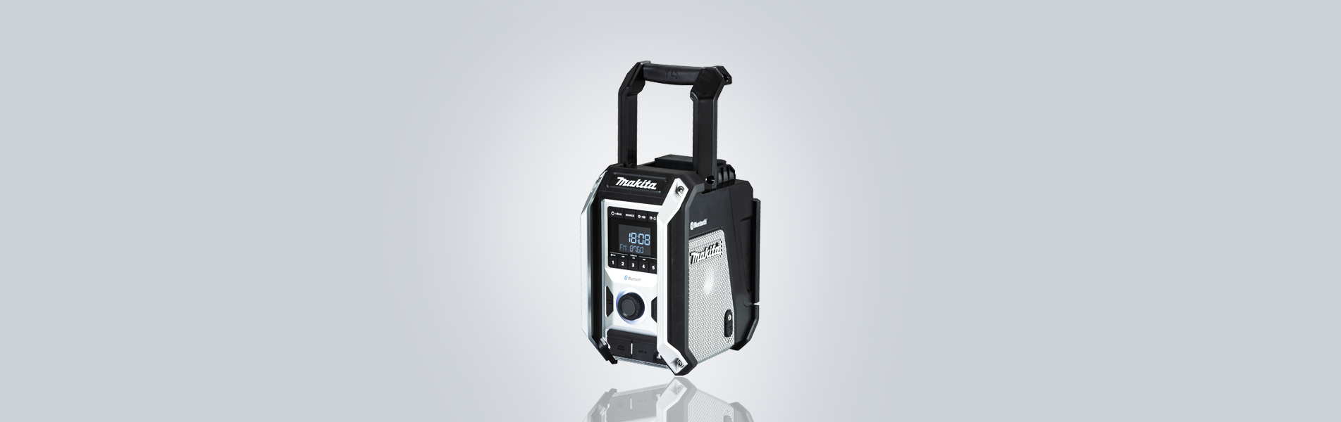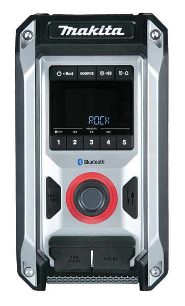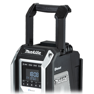 Booming and durable job site radio with IP65 rating. Equipped with Bluetooth function for wireless playback from a mobile device. Runs with an AC adapter and also with Makita Li-ion batteries.