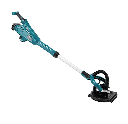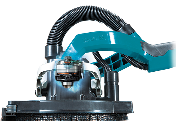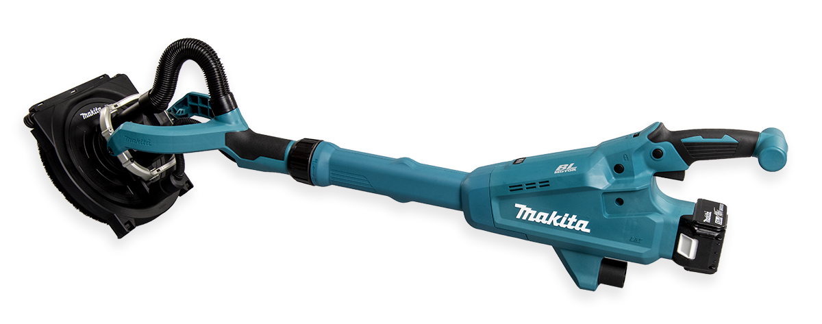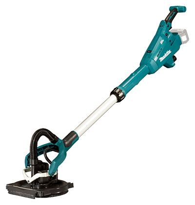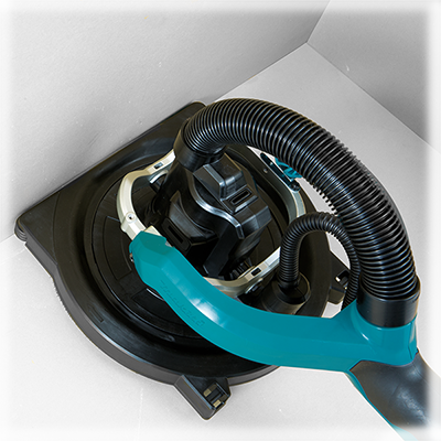 Unlike many other machines available on the market, Makita’s drywall sander is equipped with a smartly designed pad guard to enable sanding around the edges. In addition, the pad guard has a removable top part, which covers rolls that spin sideways. The rolls can be supported against the ceiling for sanding close to the corners of walls and ceilings.