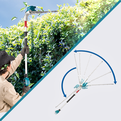 DUN500W offers excellent balance of reach, efficiency and safety. This 18V LXT® Pole Hedge Trimmer has a long shaft which makes it perfect for long and tall hedges. Its foldable structure makes it easy to store and transport. New sharp edge blade allows cutting branches as thick as 23,5 mm, and makes cutting effortless. Blade's angle is adjustable up to 115° making it easy to cut the top and side of the hedge.