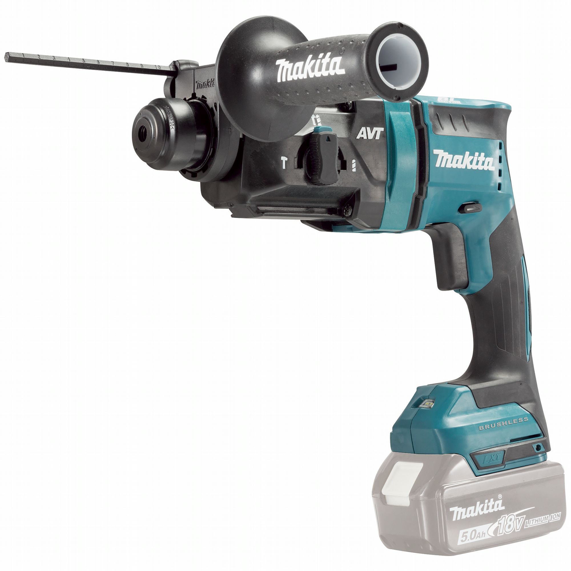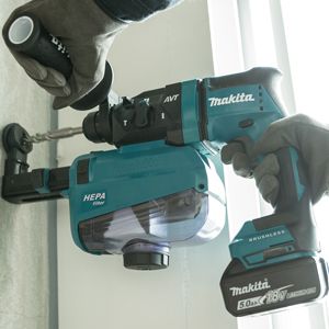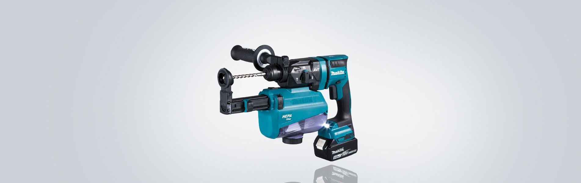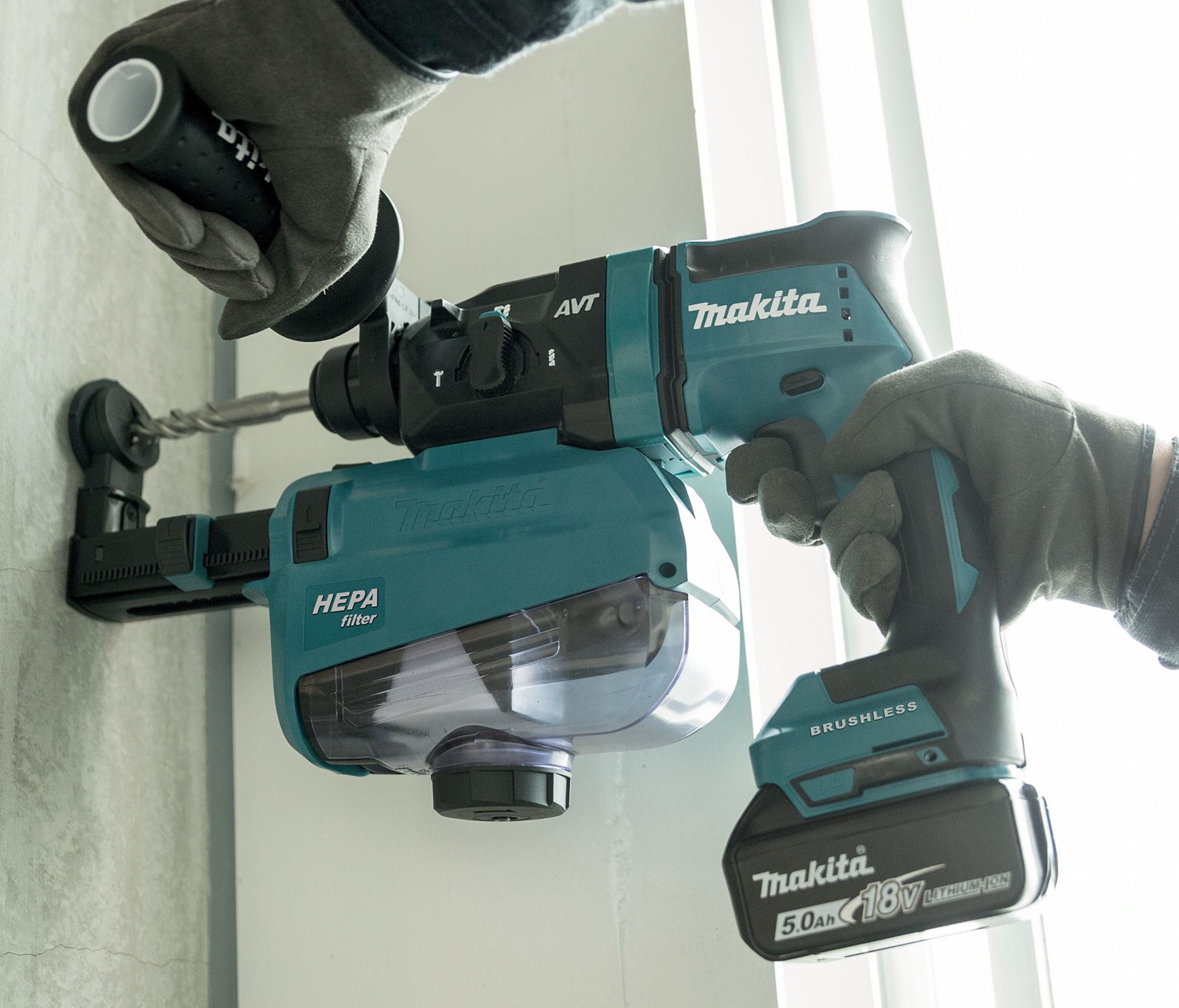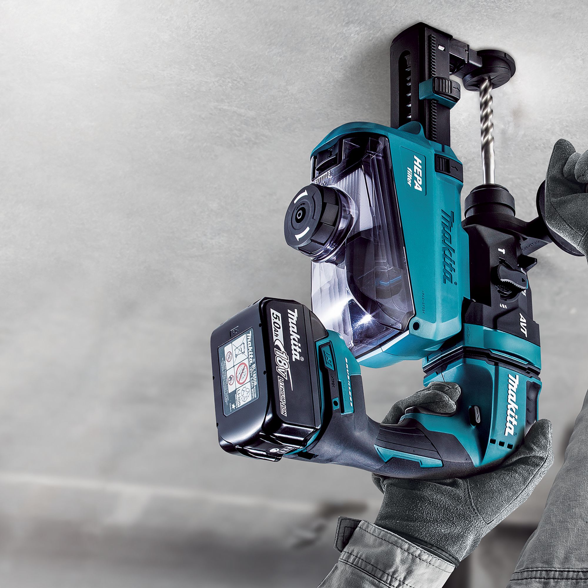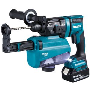 The machine is available in two models. DHR182RTWJ comes with a dust extractor attachment, two 5.0 Ah batteries and a rapid charger. DHR182Z is a body-only version without the dust extractor attachment, batteries and charger