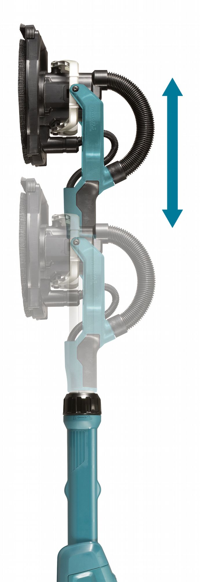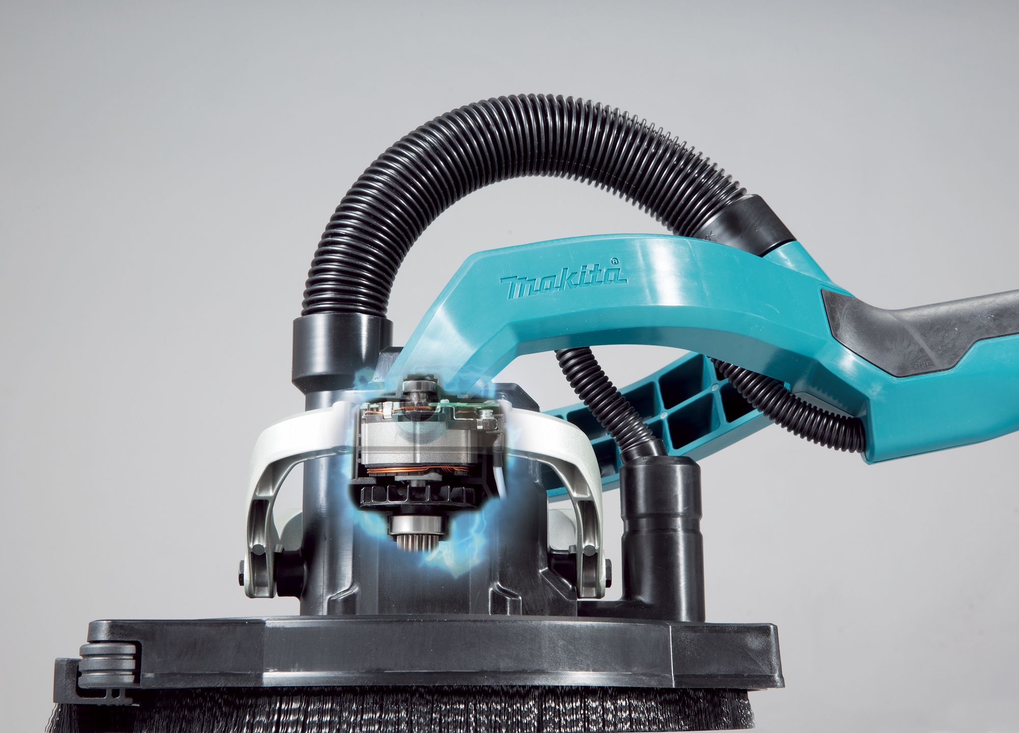 The rotating speed of Makita’s DSL800ZU drywall sander can be adjusted between 1,000 and 1,800 min-1. The machine is equipped with a soft start function for added convenience. It is AWS compatible and delivered with an AWS chip. With the AWS chip, the machine is connected to a compatible AWS vacuum cleaner via a Bluetooth connection automatically when the machine switches on.
