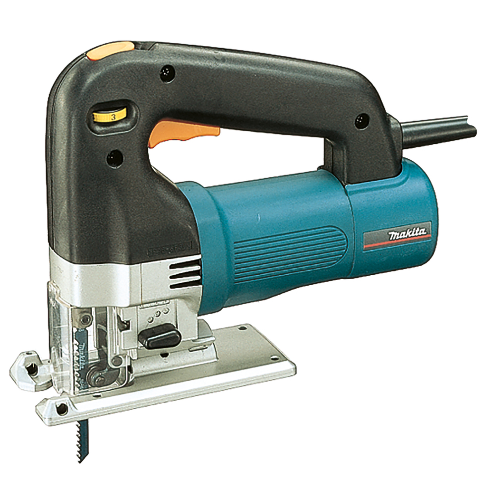 An efficient and light 600 W jigsaw with three-stage pendulum action. Effective anti-vibration system and low noise levels. Engine speed can be adjusted between 500 and 3 000 min⁻¹ to suit the material. A stroke length of 26 mm and cutting capacity of 110 mm in wood and 10 mm in steel. Tilting aluminum base.