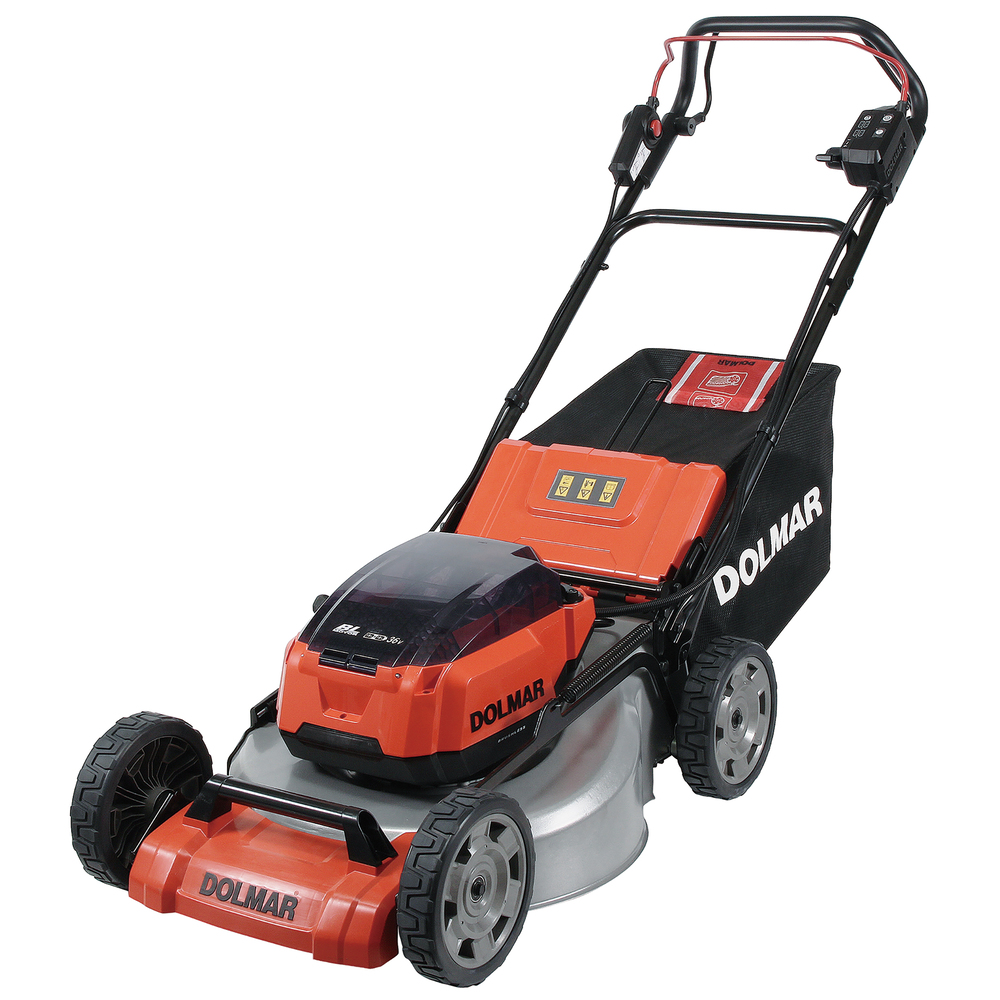 Strong steel frame Driving and bio-cutting, collecting, side discharge cordless lawnmower. Centralized cutting height adjustment and ball-bearing wheels, cutting width 53 cm. Infinitely variable speed control, load sensing and four battery bay, recommended cutting area of 2,300 m².