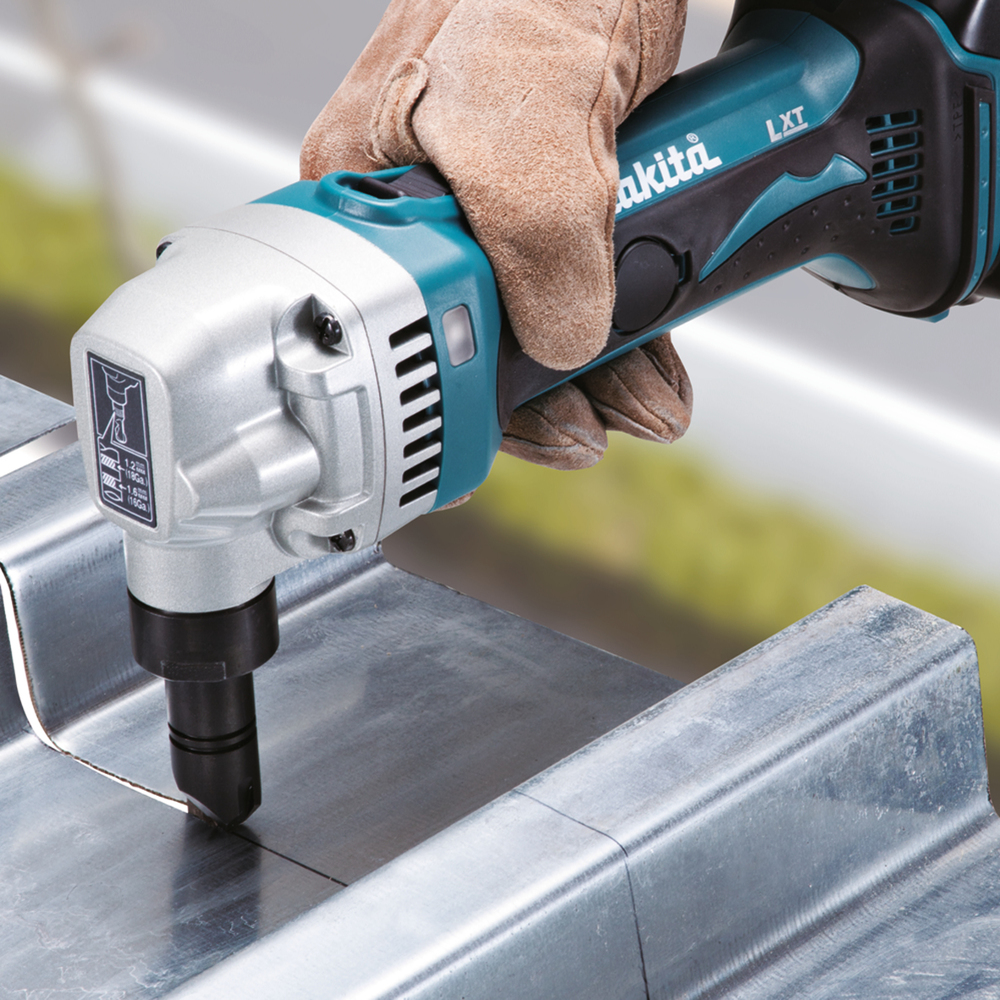 A slimline nibbler with a 14,4V LXT battery that achieves precise arced and straight cuts cleanly. Ideal for cutting profile sheets, such as roofing materials. The nibbler die rotates 360 degrees