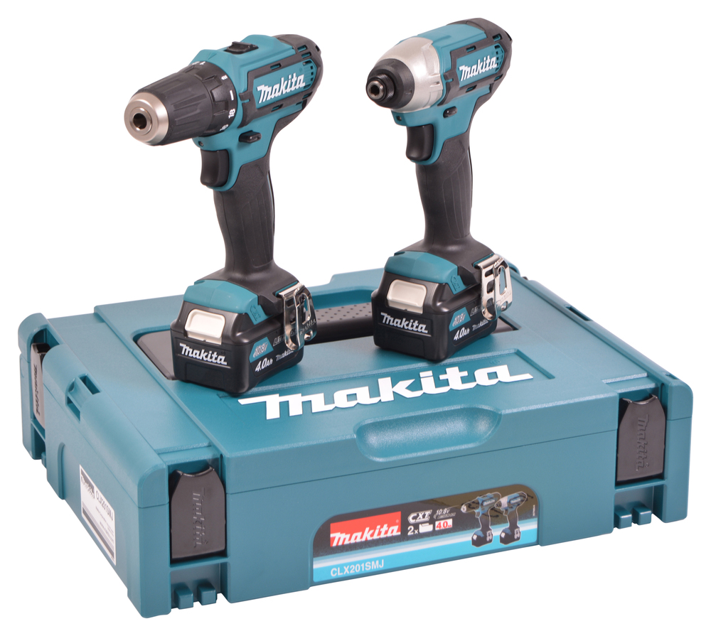 A two-piece 12V max CXT kit with light and compact cordless tools. Includes the DF331D drill, the TD110D impact driver, two 4.0Ah batteries and a charger in a Makpac case.