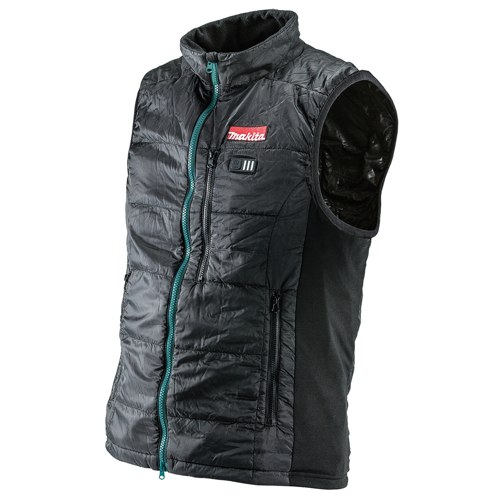 A heated vest with an 18 V LXT battery for harsh conditions. The water-repellent material protects against light rain. Heating elements on shoulders and back, three heating settings. The run time with a 5,0 Ah battery is 8 / 16 / 28 h, depending on heating level.