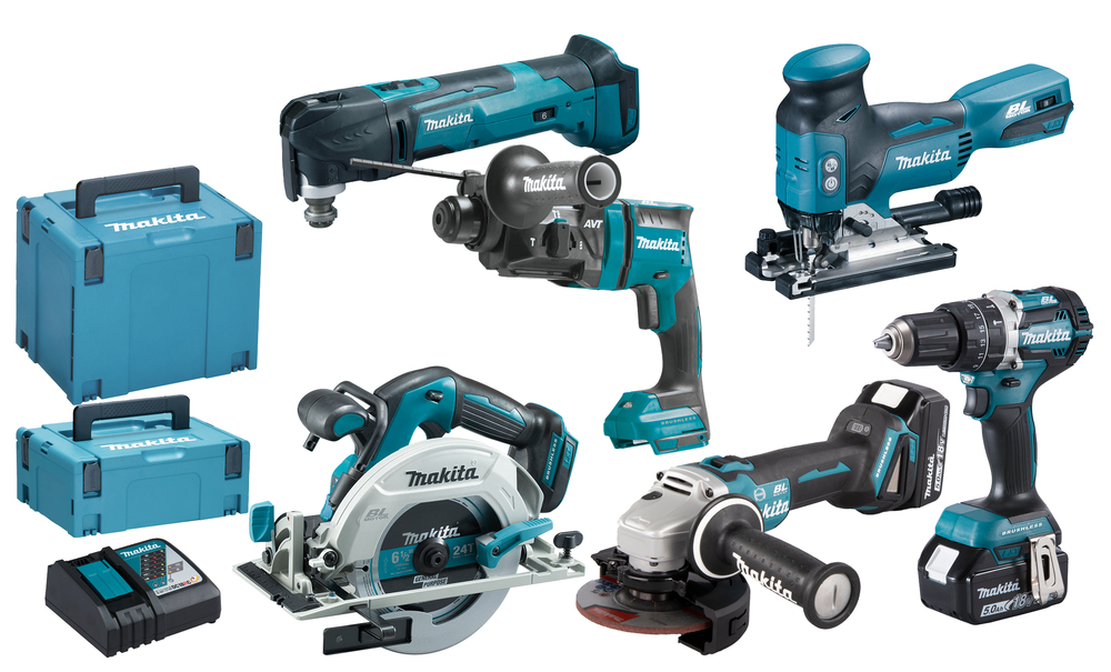 A 18V LXT® kit with comprehensive set of cordless tools. Includes the DHP484 combi drill, DHS680 circular saw, DJV181 jigsaw, DHR182 rotary hammer and DGA506 angle grinder. Two 5,0 Ah batteries and a charger in a Makpac case.