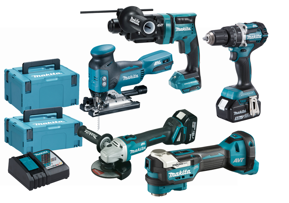 A high-quality five-piece cordless and brushless 18V LXT kit for daily use on building and renovation sites. Includes the DDF484 drill, DHR182 rotary hammer, DJV181 jigsaw, DGA506 Angle grinder and DTM52 Multi tool. Two 5,0 Ah batteries and a rapid charger in a Makpac case.