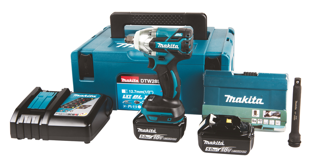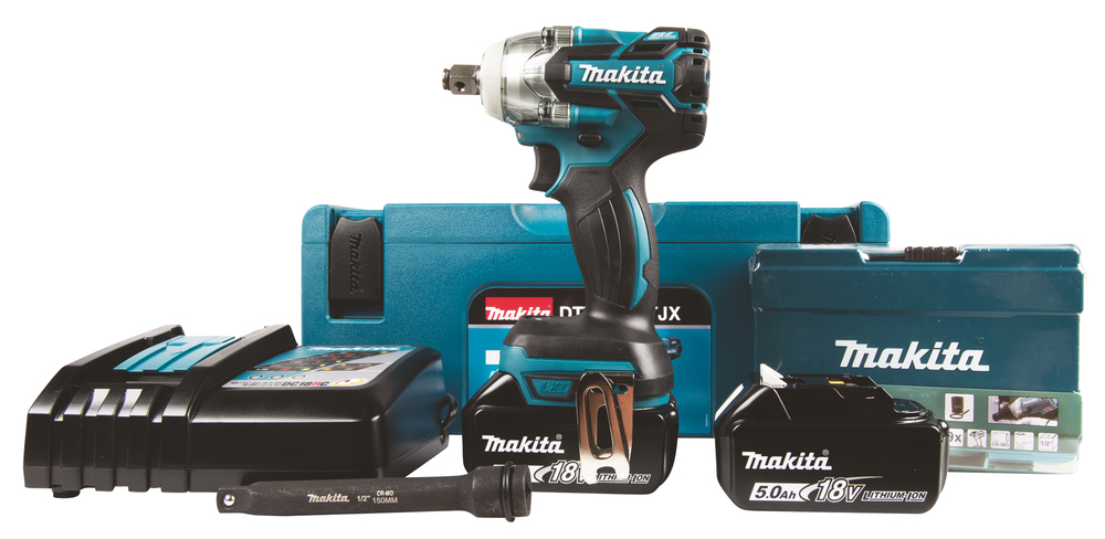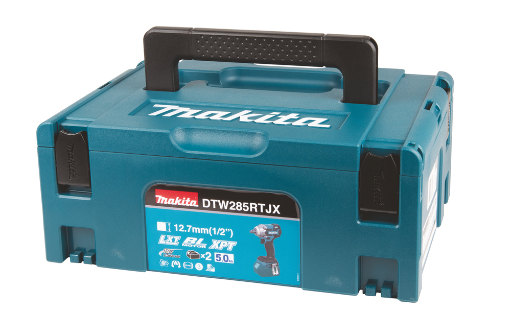 An extra-compact, 147 mm-long, 1/2" drive impact wrench. Small size and light weight make this tool easy to use, while offering a max. fastening torque of 280 Nm. Three power settings. A handy LED light for added lighting. Two 5.0 Ah batteries and a rapid charger in a Makpac case.