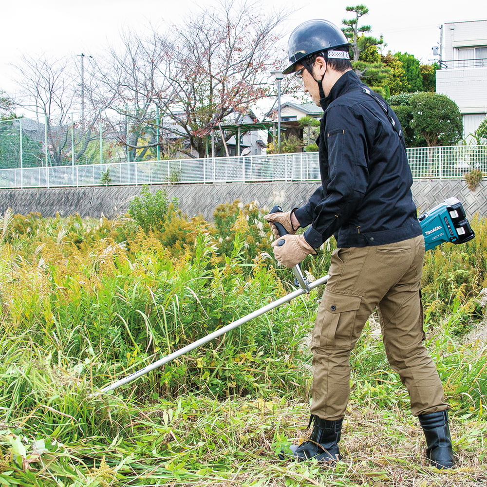 Brush cutter with brushless motor with side handles. Low noise and vibration. The high 36V voltage is achieved with two 18V batteries connected in series. Adjustable RPM and reversal. Without battery and charger.