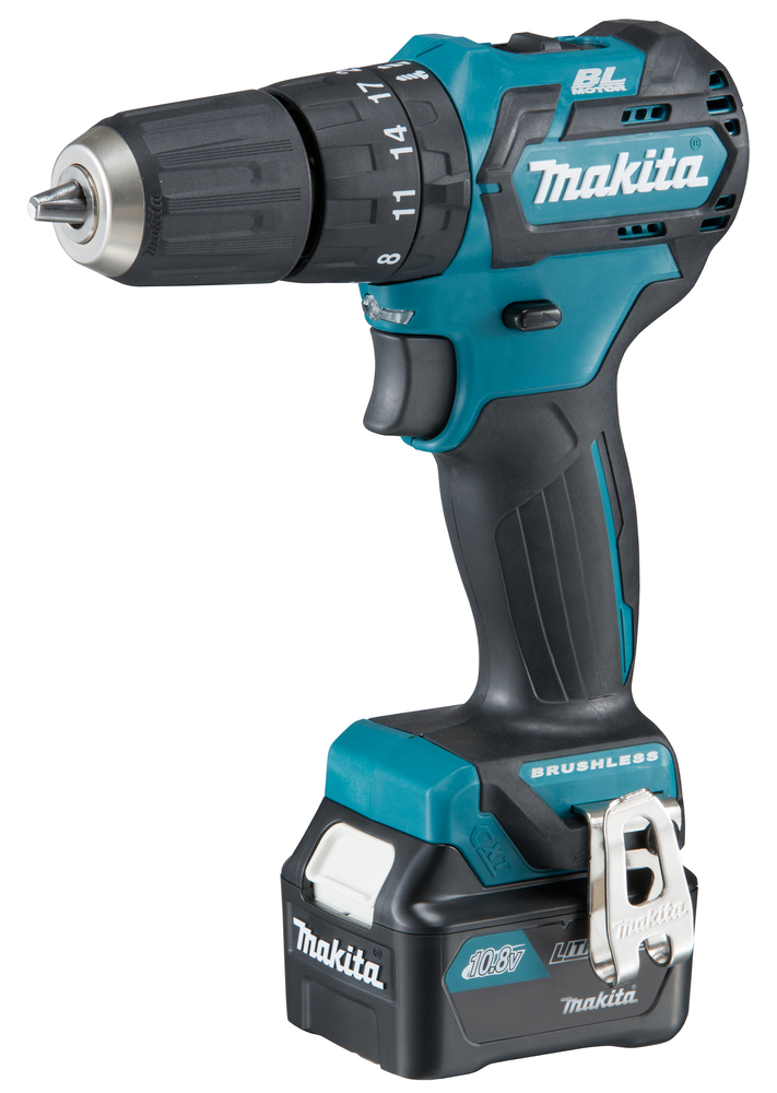 A lightweight, brushless drill for screwdriving and drilling with or without hammer action, two power settings. Maximum torque of 35 / 21 Nm. A versatile tool for fitters, builders and maintenance staff. Integrated LED light. Two 4,0 Ah batteries and a charger. Comes in a Makpac case.