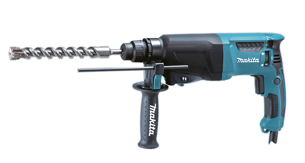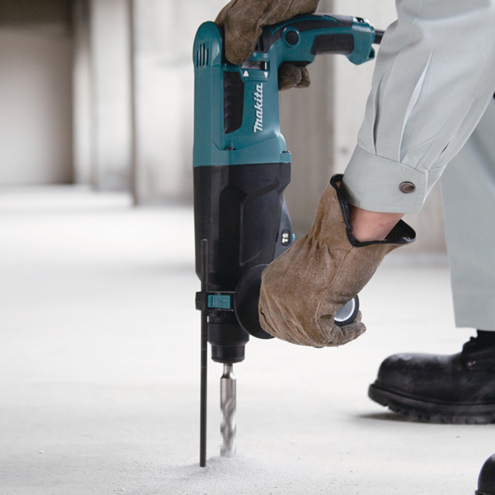 Efficient combination hammer compatible with SDS-Plus bits. Suitable for for "Rotation Only", "Hammering with Rotation" or "Hammering Only". Motor capacity of 800 W and speed can be adjusted between 0 and 1 200 min-1 from a switch. Impact energy of 2,4 J and optimal drilling range of 8 – 18 mm in concrete. Max. drilling capacity of 26 mm in concrete.