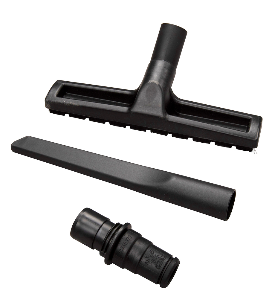 The standard equipment includes a cleaning kit, the stainless steel suction pipes of which can be cut into three parts. This allows all accessories to fit in the accessory bag supplied with the vacuum cleaner. Adapters are also supplied with the machine, which allows the vacuum cleaner to be connected directly to most work machines without separate adapters. The bag used in the vacuum cleaner is a fleece bag, which also withstands moisture well, and does not tear the bag out of the tank when lifted like paper bags.
