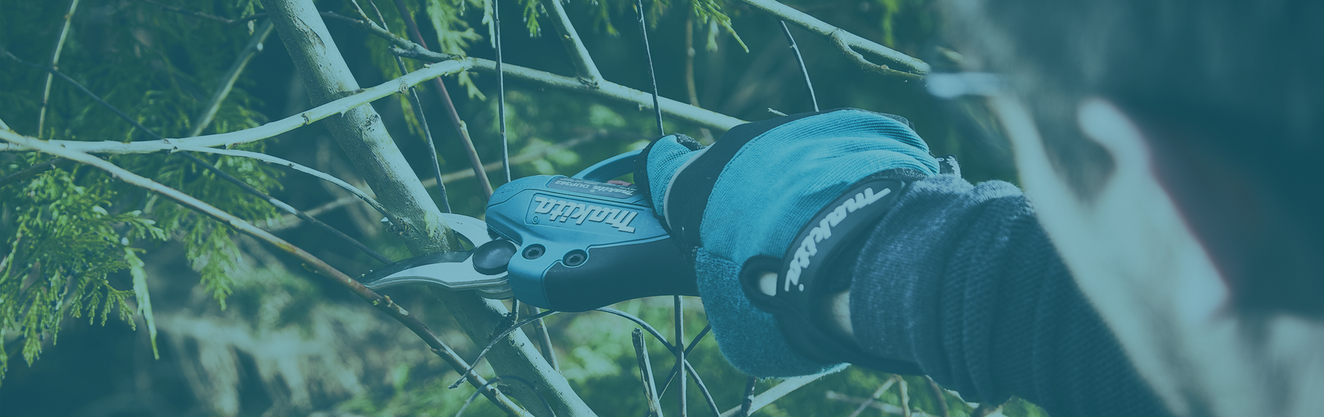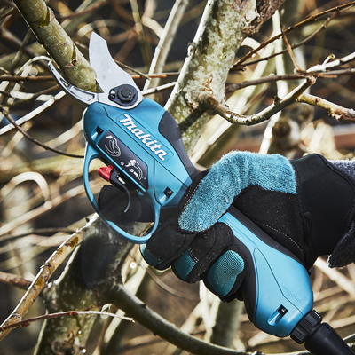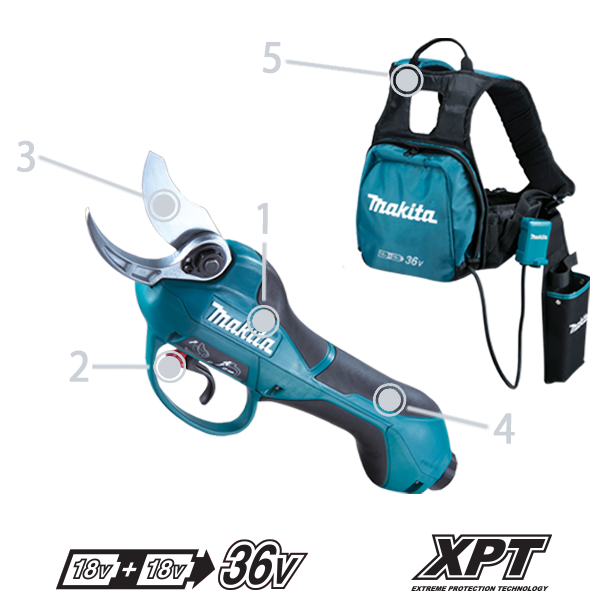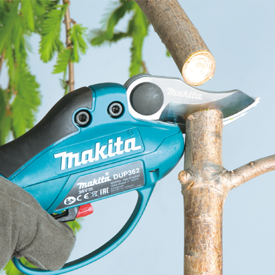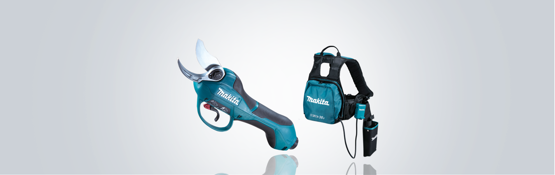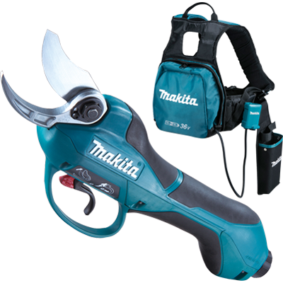 Makita's new Pruning Shears LXT® make cutting twigs and branches quick and easy. Two 18V LXT batteries deliver 36V power. The batteries are placed conveniently in a harness, freeing both hands to operate the tool. Extra sharp, Made-in-Japan forged blade opens up to 54 mm, allowing cutting branches as thick as 33 mm with the strength of 250 N.